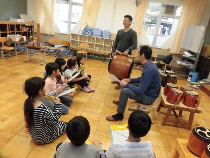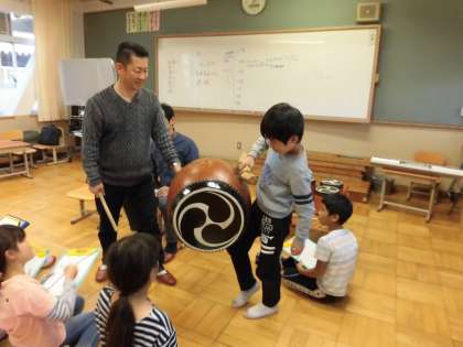 大きな太鼓を持たせていただき,重さや音を体感することができました。