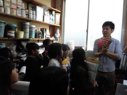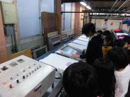 大藪小学校の本バッグのプリントをしてくださった「ヤマーダ」の工場で,バッグやTシャツ,タオルなどの製品にプリントをする工程について教えて頂きました。