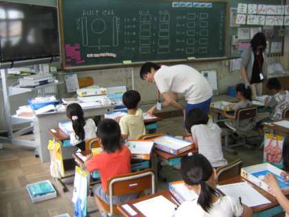 1年生では,数の勉強をおはじきのゲームを通して行っています。みんな楽しそうに勉強しています。久世中学から来てくれているお姉さん先生もやさしく教えてくれます。