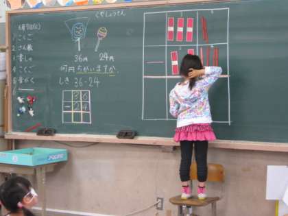 2年生・・・ひきざんの筆算をみんなの前でがんばって説明しています。