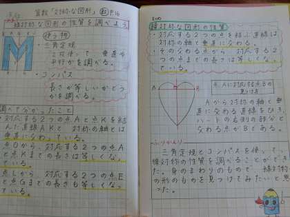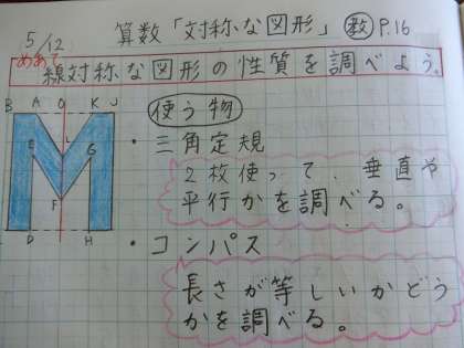 今日の先生の久世ノートです。6年生の学習する単元の「対称な図形」の学習をしました。教科書を見ながら進めました。日付,めあて,ふりかえりも書きました!