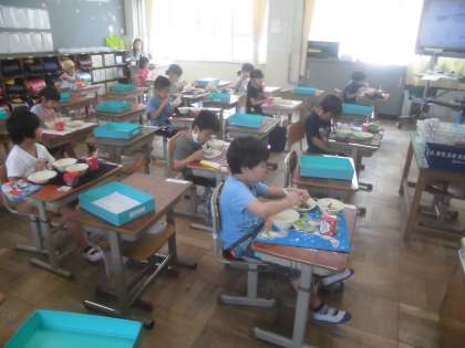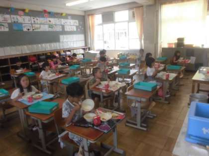 本日,Bグループの1年生にとっては,初めての給食でした。温かい給食を美味しそうに,ニコニコ行儀良く,食べ進めることができました。