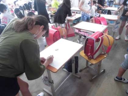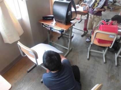 最初の学習ではランドセルの絵を描きます。毎日使っているランドセルですが,じっくり見ると今まで気がつかなかったことも・・・みんな集中して下絵を描いていました。