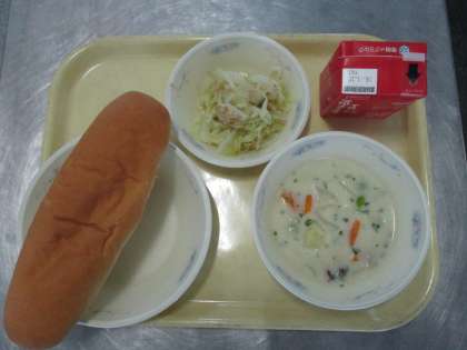 コッペパン,牛乳,,ツナサンド(具),チャウダー です。