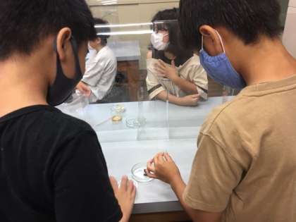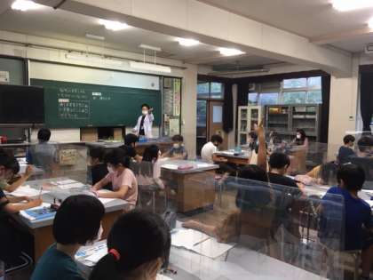 5年生の理科は新型コロナウィルス感染防止のため、パーテーションを設置された理科室で工夫をしながら授業が行われていました。