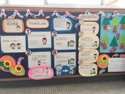待っている間にクイズを出しています。その答えと解説は保健室前にけい示しています。
