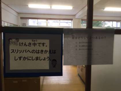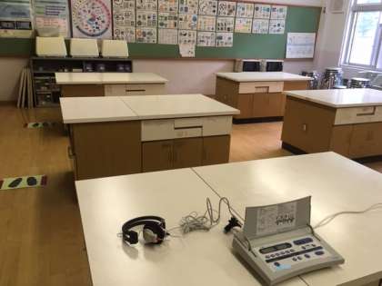 聴力検査はとても小さな音を聴くので、学校の中で静かな教室「家庭科室」で実施しました。新型コロナウィルス感染防止の対策をとりながら、待っている間も人との間隔をあけていました。