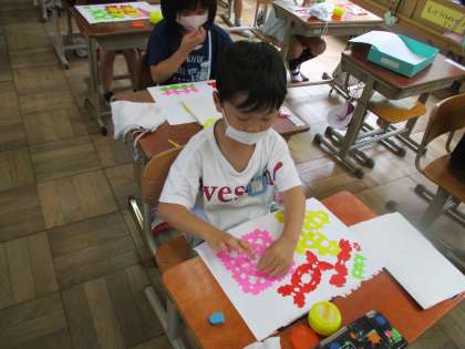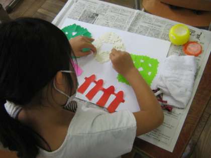 先週,図工で切ったおりがみのかざりを,今日はのりで画用紙に貼りました。