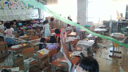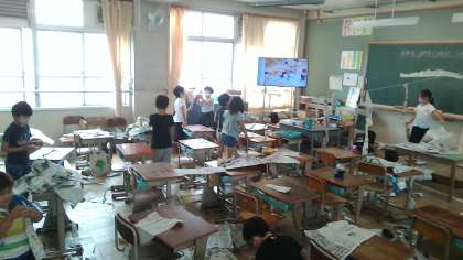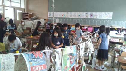 今日の5,6時間目に,図画工作科「つないで つるして」の学習をしました。新聞紙を手でちぎって,教室の中で,つないだり,つるしたりしました。