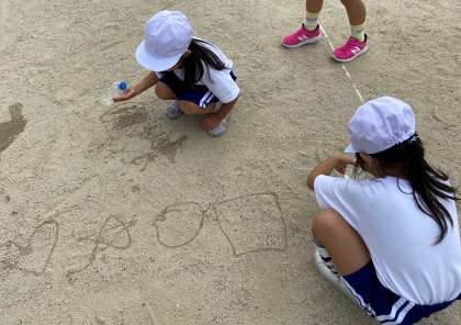 また,水で地面に絵を描いて楽しむ子もいました。ペットボトルをもったままぐるっとまわり,きれいな円を描いたり,何人かで水を合わせて川や池を作ったりしている子もいました。