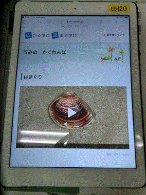 今日は,教科書の写真の下についているQRコードを,1人1人タブレットで読み取り,実際にはまぐりや,たこ,もくずしょいがどのようにかくれていくのかを動画で見ました。はまぐりが足を動かして砂の中にかくれていく様子や,たこが,一瞬で周りの岩と同じ色に変わる様子を見て,子どもたちは目を輝かせて見ていました。
