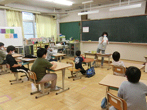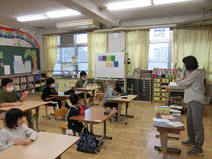 国語と算数の学習で,授業の始めに,フラッシュカードを使って学習の確認をしています。1年生はひらがな,2年生は習い始めた漢字を,5,6年生は習った漢字だけではなく,日常でよく目にする漢字を出しています。わからない時は,ヒントタイムとして,裏の絵をちらっと見ることができ,「たまご!」など元気な声で答えています。自分の問題だけではなく,友だちの問題も一緒になって考えて,思わず答えを言ってしまうことも・・。子どもたちの大好きな学習の時間の一つです。
