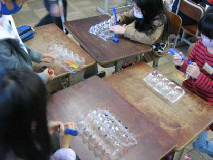 今回は,卵パックに色をぬり,光を通して見える形や色を楽しみました。いろいろな色を混ぜている子,星や花びらなどの形でぬっている子がいて,それぞれに工夫をしていました。