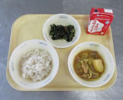 麦ごはん,牛乳,肉じゃが(カレー味)、小松菜とひじきのいためもの です。
