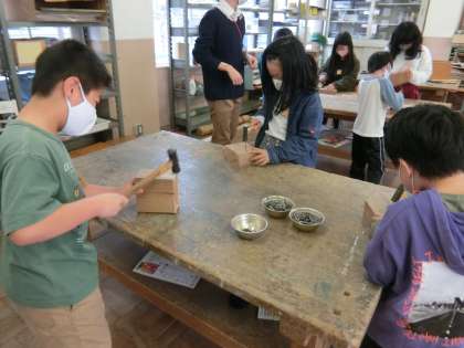 金づちの扱いや,釘の打ち方を練習してから,木に釘を打ちました。