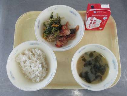 麦ごはん,牛乳,鶏肉のてり焼き,切干大根のごま煮,みそ汁 です。