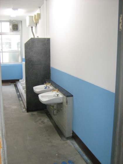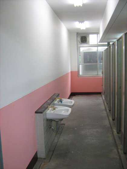 7月下旬に南支部管理用務員共同作業で北館のトイレをきれいにしていただきました。今までは何か暗いイメージだったのですが,あざやかな水色とピンクのペンキで塗っていただき,とてもきれいで明るいイメージのトイレに変身しました。