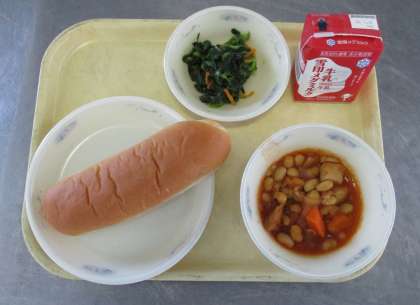 ミルクコッペパン,牛乳,大豆と鶏肉のトマト煮,小松菜のソテー です。