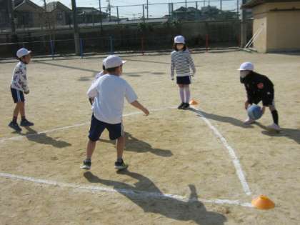 ボールに当たらないようにジャンプをして逃げたり,ボールを当てるために素早くボールを転がしたり,子ども達はそれぞれ工夫しながら楽しんでいました。