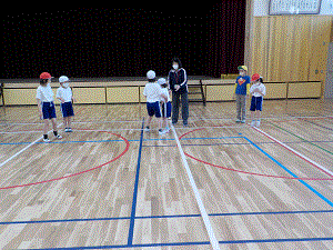 今日は体育館で体育をしました。並び方の練習や,準備運動をしてから,まねっこ歩きをしました。カニになったり,ぞうになったりと色々な歩き方で体を動かしました。最後に「ドンじゃんけんぽん」をしました。「○○さん,次行って〜。」と声かけをしたり,「○○さん頑張って!」と応援していたり素敵な姿が見られました。