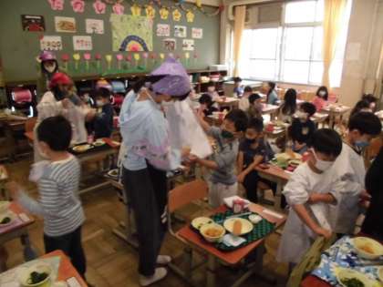 昨日から給食が始まりました。1年生の初めての給食を,スムーズに進めるために,6年生が手伝いに行ってます。また今年度,教室が3階になった2年生の手伝いにも行っています。