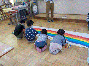 みんなで描いた虹の周りに,絵を描きました。大好きな車やキャラクター,家や花やハートなど楽しい虹になっています。出来上がった虹は,教室の後ろに掲示する予定です。楽しみですね。