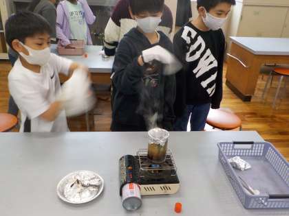 今日の実験では,木やマツボックリなどを,二つの方法で燃やしました。空気があるところとないところで燃やし,燃え方の違いを発見しました。最後には,いろいろな植物の炭を作りました。
