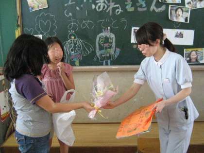 ひまわり学級に,歯の指導に来てくださっている横田歯科の○○お姉さん(歯科衛生士さん)が,この度ご結婚を機に京都を離れられることになりました。とてもおめでたいお話なのですが,長年ひまわり学級に来ていただいていたので,子どもたちにとってはとてもさみしいお別れとなります。○○お姉さん,今まで本当にありがとうございました。