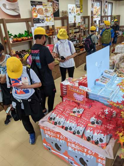 お土産タイムです。買いたいものがたくさんあって、悩んでいる人もいます。何を買ったのか楽しみにしておいてください。