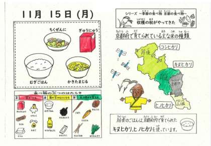 「筑前煮」には,ちくわ,にんじん,ごぼう,れんこん,三度豆,こんにゃくが入っていました。それぞれちがった食感を楽しめたのではないかと思います。