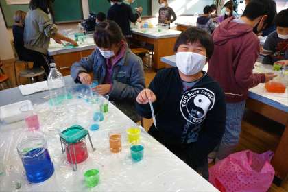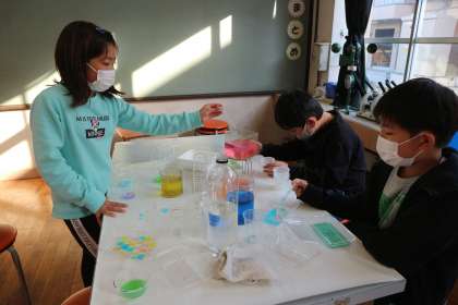 光の反射,色水の重なりからどんどんきれいな所を見つけていきました。