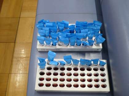 尿検査はおしっこの中にたんぱくや糖,血液などが混じっていないか,きちんと腎臓が働いているかを調べる検査です。日頃,自分では気が付きにくい病気を見つけてくれるとても大切な検査でもあります。この2日間でほぼ全員が提出できました。