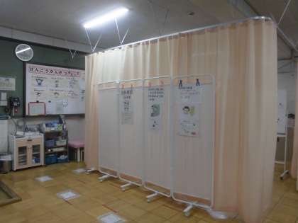 内科検診はひとりひとり仕切りカーテンの中に入って検診を行っています。発育の様子,背骨の状態や心臓や肺の様子,皮膚の様子など全身の状態を診ながら聴診器をあてて丁寧に診ていただきました。