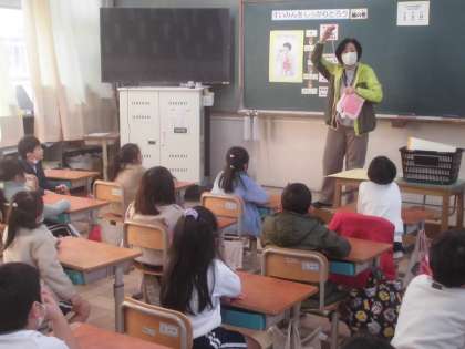 測定の前に教室で「すいみんをしっかりとろう 〜腸の巻〜」の学習をしました。食べた物がどのように便になっていくのか、眠っている間に小腸や大腸が働いているのでしっかりと眠ることが大切であること、便は自分の体の健康状態を教えてくれるので便が出た時は流す前に確認をしてから流すことなどを話しました。