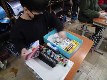 お道具箱の中をどのようにしたらいいのかを工夫しながら