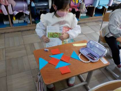 きょうは、いろがみを つかって、いろんな かたちを つくりました。