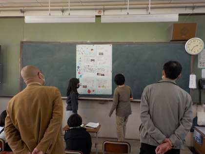 1学期から続けて学習してきた総合の学習のまとめとして、グループごとに調べた内容を発表しました。調べているときに、インタビューに行かせていただいた方にも来ていただき、とても盛り上がった発表会になりました。