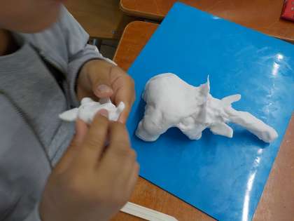 粘土で自分もつくり、動物に乗せたり横に並べたりして、お話しながら楽しんでつくっていました。