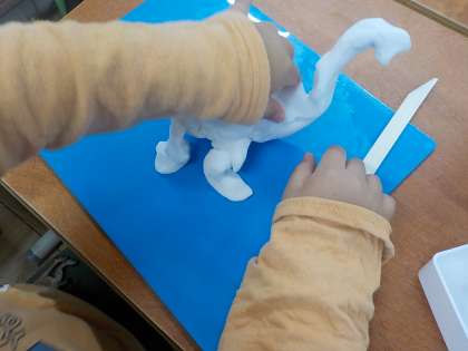 自分と一緒にさんぽに行きたい仲間をおもいうかべて、粘土でつくりました。粘土をひねりだして手足にしました。