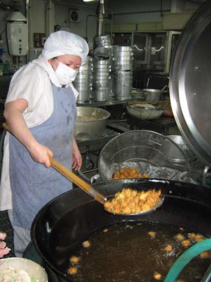 今日の給食にでるがんもどきは給食室で1こずつ手作りで,心をこめて作っていただきました。家では買って料理することが多く,野菜といっしょに煮たり,あんかけにしたり,昔からよく食べられてきました。