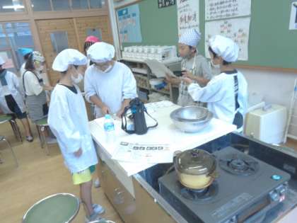 山の家に向けて調理実習で、ご飯とみそ汁を作りました。普段は炊飯器で炊くご飯ですが、ガラス鍋を使って、ご飯が炊ける様子を確認しました。鍋で作ったご飯は少し「こげ」もありましたが炊きたてのご飯をとても美味しそうに食べていました。山の家での野外炊事でも美味しいご飯が作れるといいですね。