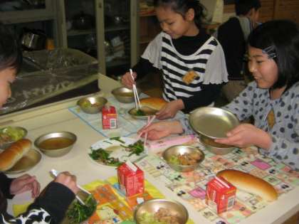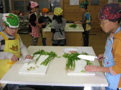 総合的な学習で久世地域の特産物として学習した「京せり」を使って調理体験をしました。ベーコンと一緒に炒めました。初めて食べた児童が多かったのですが,「シャキシャキとした歯ごたえですごくおいしいと」言っていました。