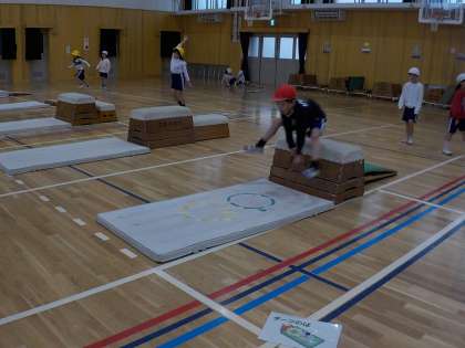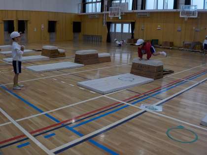 ペアの友達と手のつき方や、着地などを確認しながら進めています。