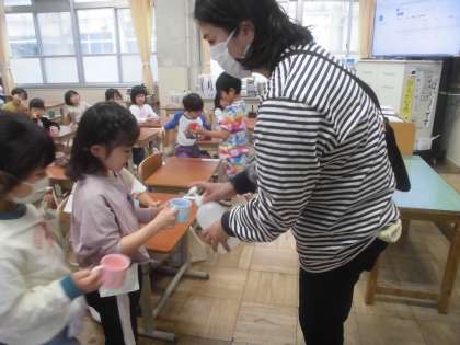 1年生は、今日までに水でぶくぶくうがいの練習をしました。初めてのフッ化物洗口でしたが、とても上手に行うことができていました。