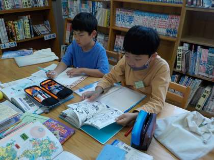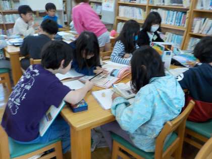 今回は国語の学習で図書館に行って、各地の名産品や名所を調べました。
