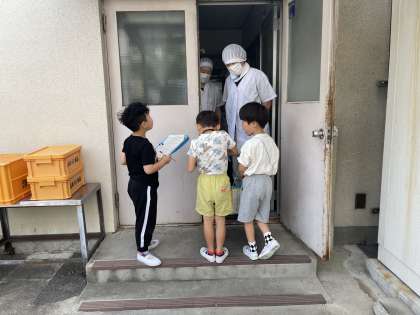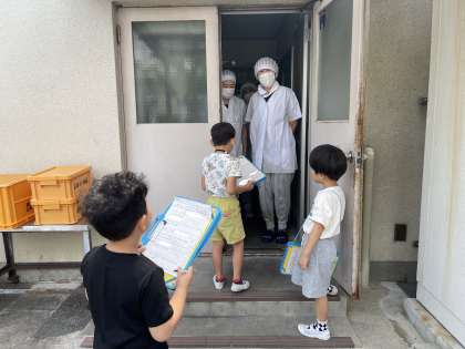 今日は、給食調理員さんにインタビューをしに行く子がいました。