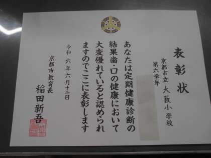 よい歯の児童は4月の歯科検診で学校歯科医の先生に選んでいただきました。う歯がない、不正咬合・歯列不正がない、歯周疾患がない、口腔の清掃状況が良い の4つの条件を満たしている人が選ばれています。