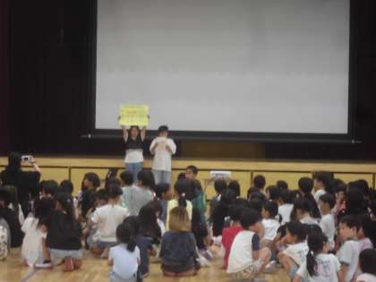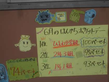 6月の結果報告をおおやぶタイムで行いました。6月は全校で74パーセントの子どもたちが ポケットにはんかちが入っていました。