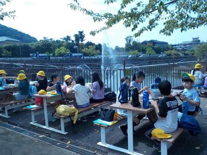 琵琶湖疏水噴水を見ながら、おいしいお弁当に大満足の4年生でした。