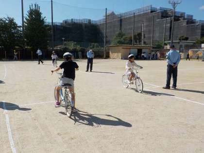 21日(月)に、南署と久世交通対策協議会の皆様にお世話になり、自転車教室を開きました。自転車の乗り方や交差点でのルールなど、たくさんのことを教えていただき、左右だけでなく、前方や右後ろまでしっかりと安全確認をして、自転車に乗る姿が見られました。これからも、事故の無いよう安全に気を付けて、自転車に乗って欲しいと思います。